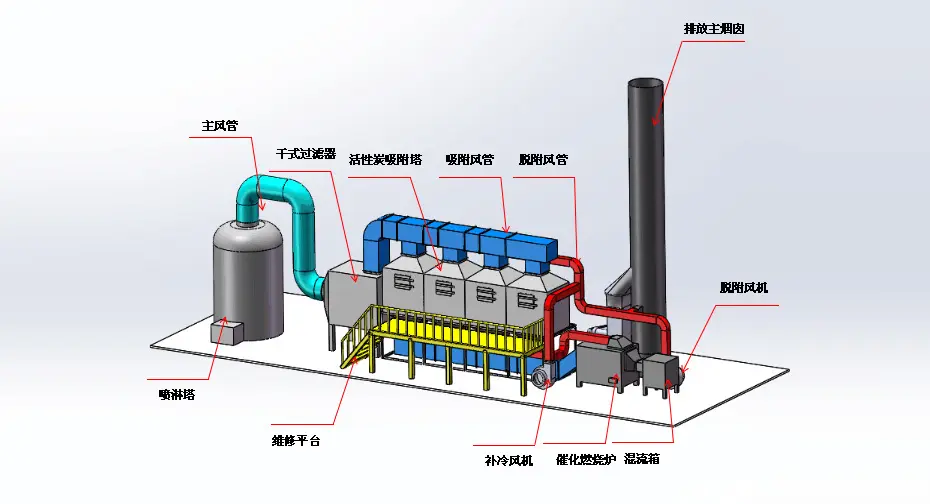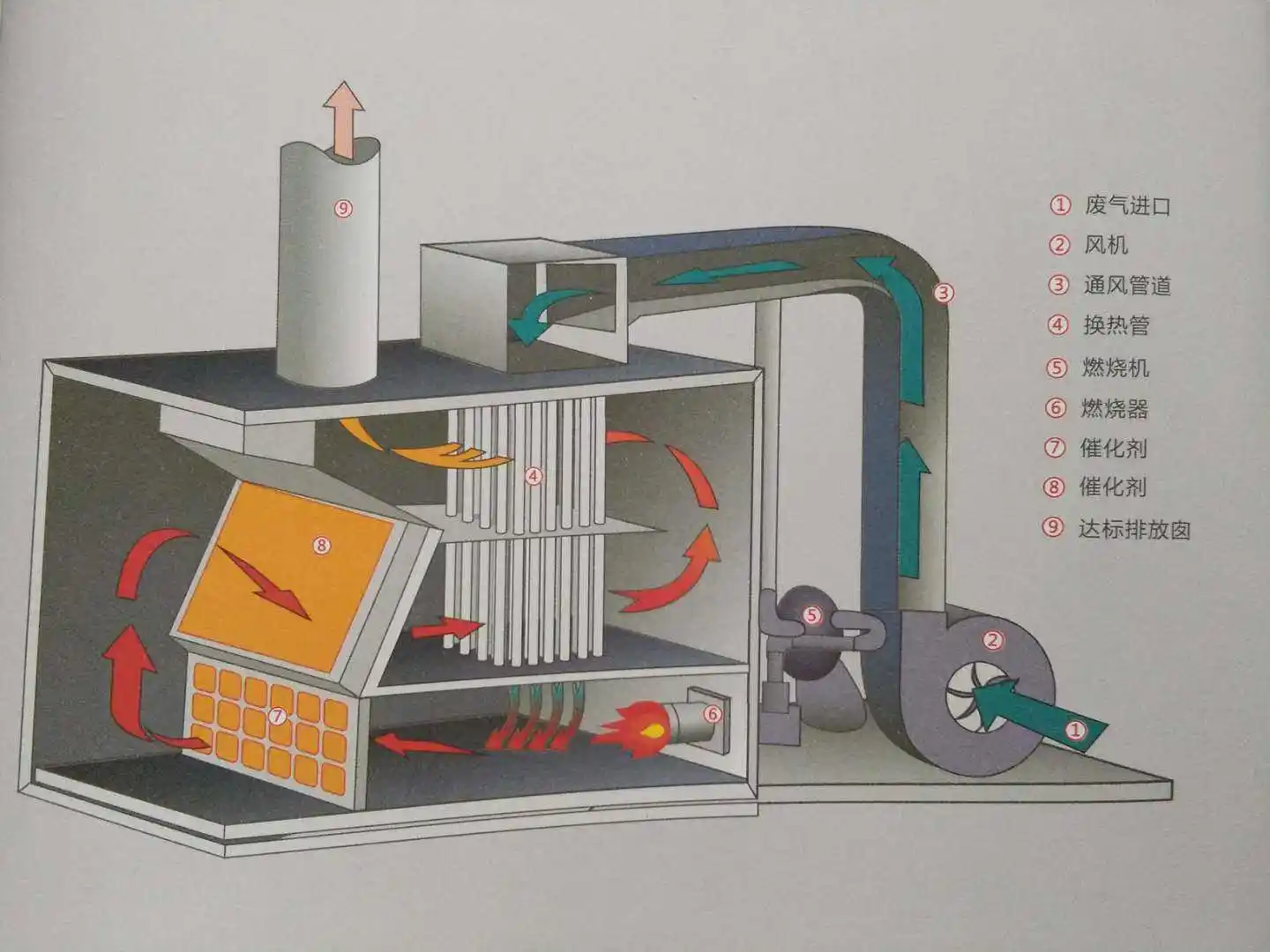 催化凈化是典型的氣固催化反應,其實質是活性氧的氧化。在催化凈化過程中,催化劑的作用是降低活化能。同時,催化劑表面具有吸附作用,使反應物分子在催化劑表面富集,提高了反應速率,加快了反應速度。在催化劑的作用下,廢氣可以在較低的著火溫度下進行無焰燃燒,并被氧化成CO2和H2O。同時,大量的熱能被釋放出來,從而達到去除廢氣中污染物的方法。通過活性炭吸附,將風量大、濃度低的廢氣濃縮成風量小、濃度高的廢氣,在進入RCO裝置進行處理,可節(jié)約運行成本。