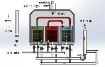 RTO把有機廢氣加熱到760攝氏度以上,使廢氣中的VOCs在氧化分解成二氧化碳和水。氧化產生的高溫氣體流經特制的陶瓷蓄熱體,使陶瓷體升溫而蓄熱”,蓄熱用于預熱后續進入的有機廢氣,從而節省廢氣升溫的燃料消耗。陶瓷蓄熱體應分成三個(含三個)以上的區或室,每個蓄熱室依次經歷蓄熱-放熱-清掃等程序,周而復始,連續工作。蓄熱室放熱后應立即引入部分已處理合格的潔凈排氣對該蓄熱室進行清掃(以保證VOC去除率在99%以上),只有待清掃完成后才能進入蓄熱程序。RTO蓄熱式廢氣處理設備,運行費用省,有機廢氣的處理效率高的優點,適應廢氣濃度1000~10000mg/m3,分解效率:99%—99.5%。是目前較為經濟可靠的達到50mg/m3嚴格的排放標準的VOCs治理技術,得到了廣泛的應用。