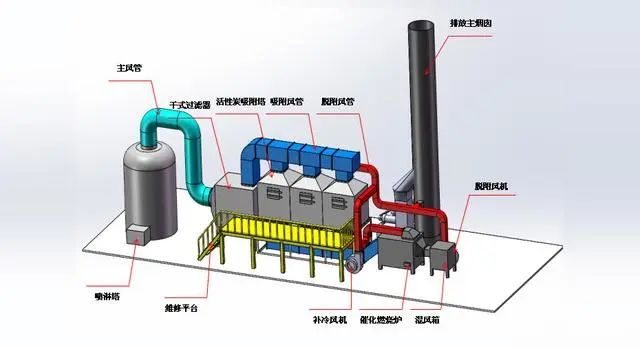系統(tǒng)由5個(gè)活性炭吸附箱(4用1備),1個(gè)催化燃燒床構(gòu)成,將各條生產(chǎn)線中的所有排氣管合并連接引入凈化設(shè)備,各個(gè)支管上安裝一只手動(dòng)調(diào)節(jié)閥,配比調(diào)節(jié)風(fēng)量;在吸附凈化裝置與廢氣進(jìn)口之間安裝一套預(yù)處理干式過濾器,過濾少量的粉塵,從而避免活性炭微孔被堵塞,然后送入活性炭吸附箱進(jìn)行吸附凈化,當(dāng)其中一活性炭吸附器接近飽和時(shí),系統(tǒng)將自動(dòng)切換到備用活性炭吸附箱(此時(shí)飽和活性炭吸附箱停止吸附操作),然后用熱氣流對(duì)飽和活性炭吸附箱進(jìn)行解吸脫附,將有機(jī)物從活性炭上脫附下來。在脫附過程中,有機(jī)廢氣已被濃縮,濃度后的濃度較原濃度提高幾十倍,達(dá)2000ppm以上,濃縮廢氣送到催化燃燒裝置,之后被分解成CO2與H2O排出。完成解吸脫附后,活性炭吸附器進(jìn)入待用狀態(tài),待其他活性炭吸附箱接近飽和時(shí),系統(tǒng)再自動(dòng)切換回來,同時(shí)對(duì)飽和活性炭吸附器進(jìn)行解吸脫附,如此循環(huán)工作。之后凈化后的潔凈氣體由主排風(fēng)機(jī)排入大氣中。