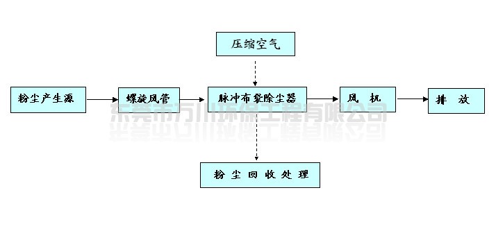 含塵廢氣在風(fēng)機作用下,通過風(fēng)管收集進入脈沖布袋除塵器,含塵廢氣進入中箱體下部,在擋風(fēng)板形成預(yù)分離室內(nèi),粉塵因慣性作用落入灰斗。廢氣沿擋風(fēng)板向上到達濾袋,粉塵被阻留在濾袋外面,干凈氣體進入袋內(nèi),并經(jīng)過袋口和上箱體及風(fēng)機再排出。